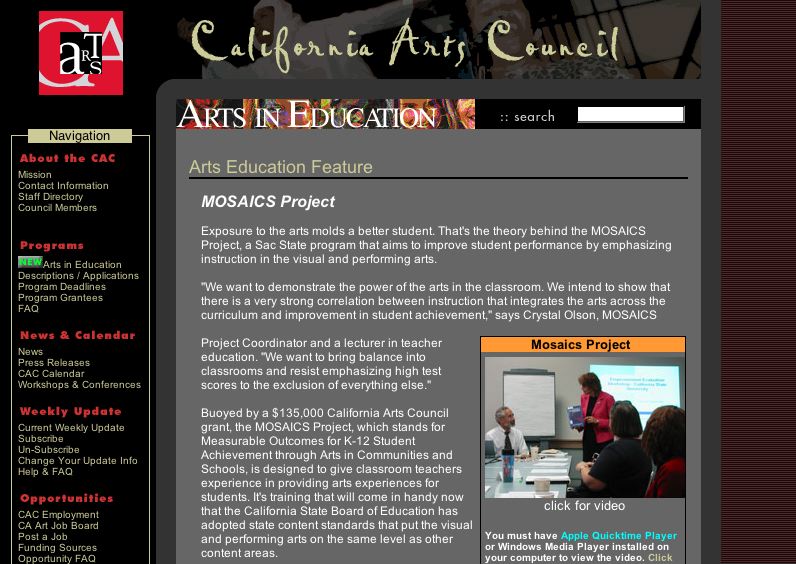 The Mosaics project is an effort to infuse the arts into education and enhance inquiry. The focus is on graduate training of teachers in the field, however, the program and project require community involvement in a substantive manner. A brief video of our work together at a recent workshop is provided below. It was also featured at the Califoria Arts Council web site.